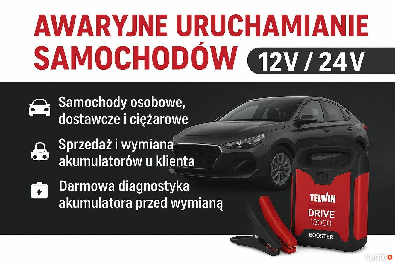 Awaryjne uruchamianie samochodów 12/24V, mobilna sprzedaż i wymiana akumulatorów u klienta