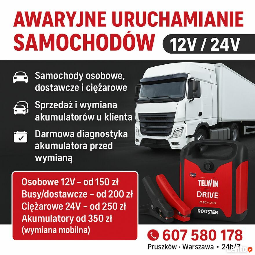 Awaryjne uruchamianie samochodów 12V / 24V + Mobilna sprzedaż i wymiana akumulatorówPruszków • Warszawa • okolice