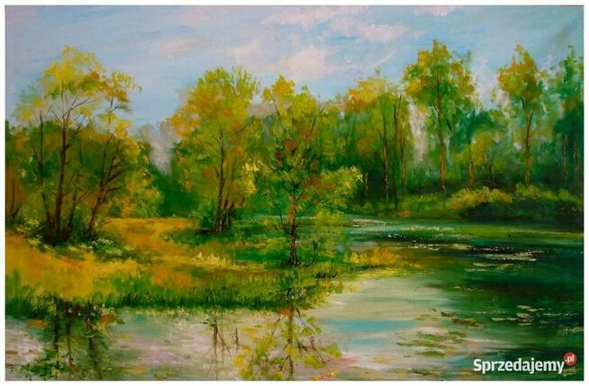 Na obrazie widać spokojny zakątek nad wodą. Zieleń dominuje, ale nie jest to jedna zieleń, tylko cała mieszanina od ...