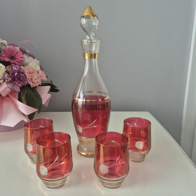 Sprzedam unikatowy komplet do napojów z lat 60-70 . Karafka z oryginalnym korkiem i 4 szklaneczki. Wykonany ze szkla cześć ...