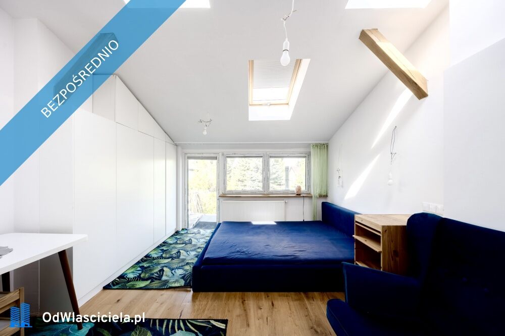 Na podłodze górnego piętra deska dębowa w pokojach i w salonie oraz gres w łazience i w kuchni, pod którym jest dodatkowe ogrzewanie podłogowe. Pod sufitem znajdują się piękne grube legary dębowe nad którymi jest 10 okien dachowych. Dach wyizolowany piana 25mm, w sypialni rolety black-out.