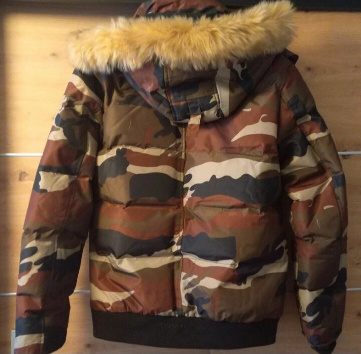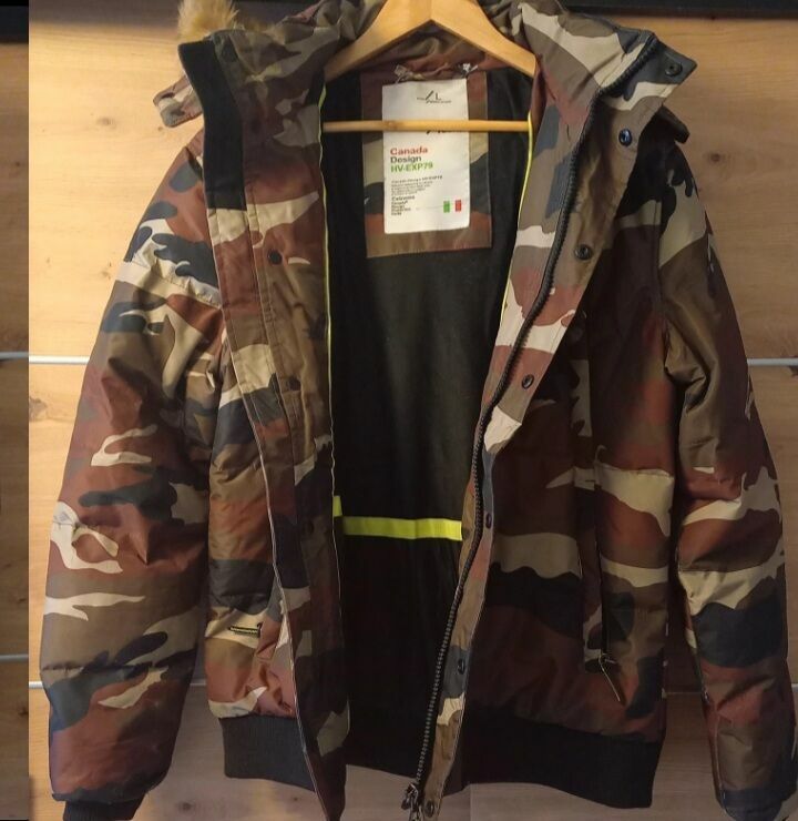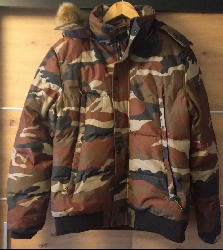 Kurtka zimowa męska w modnym wzorze moro. Wykorzystaj jej unikatowy design, aby wyróżnić się z tłumu. Produkt używany, 2 razy założona .na sezon zimowy wielokolorowy. Rozmiar L odpinany kaptur z miśkiem kieszonki z boku jak i środku.L - szerokość pod pachami 118 cm / szerokość ramion 47 cm .firma Canada polecam wyślę inpost paczkomat lub DHL po przelewie na konto