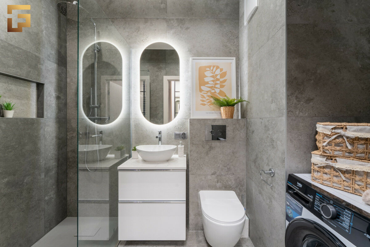 Łazienka została urządzona w jasnych, szarych i neutralnych barwach, które są niezwykle praktyczne i odporne na upływ czasu. Znajdziemy tu prysznic z odpływem liniowym oraz toaletę wiszącą, a całość prezentuje spójny i estetyczny charakter.
