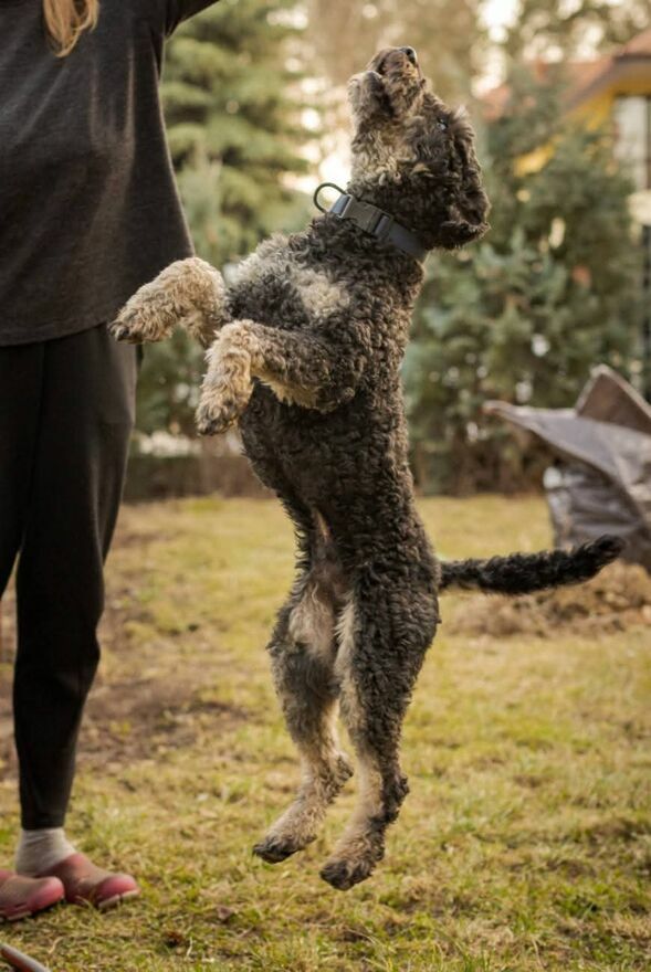 Zachowuje czystość, sygnalizuję potrzebę wyjścia na spacer. Na spacerze potrzebuje spokojnego terenu bo ma jeszcze do wypracowania zaczepianie innych psów i reakcję na samochody.
