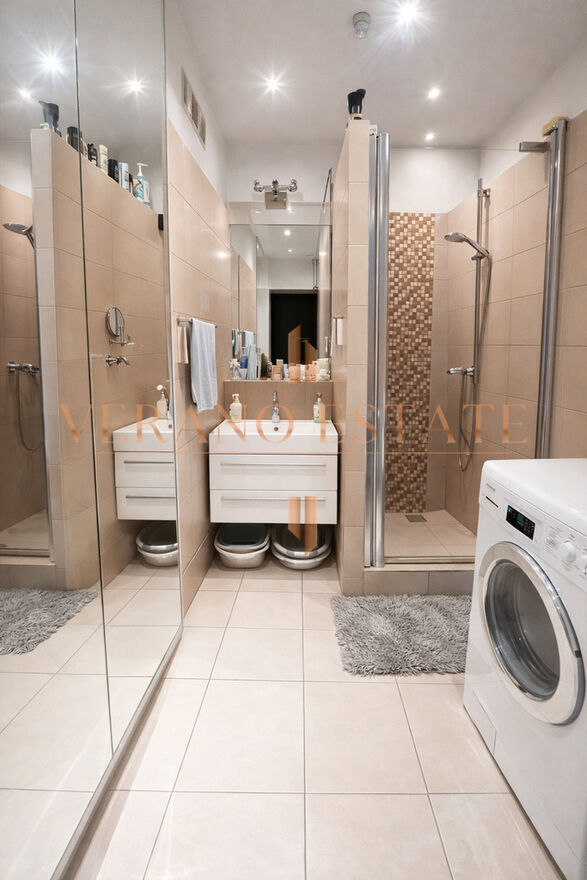 - łazienka z prysznicem oraz dużą szafą z lustrem