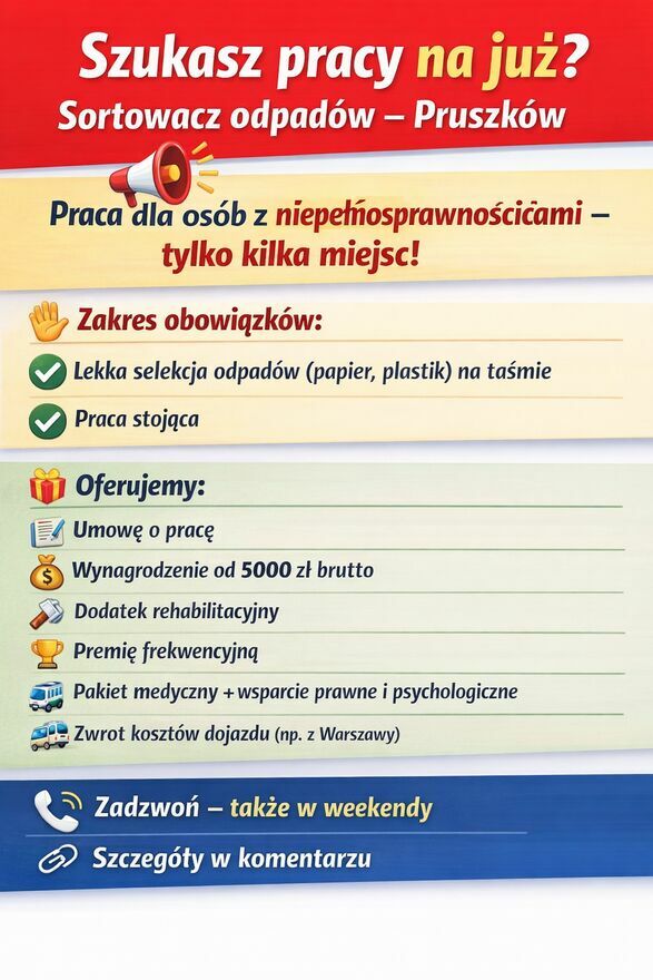 Szukasz pracy na już? Sortowacz odpadów – PruszkówMiejsce pracy: praca wewnątrz jednego obiektu w Pruszkowie